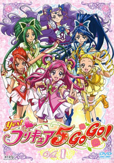 Yes! PreCure 5 GoGo! is the Fifth Pretty Cure anime television series produced by Toei Animation. It continues on from the previous series, the girls have been granted new powers in order to save the Four Kings of the various kingdoms surrounding the Palmier Kingdom and to protect Flora and the Cure Rose Garden from the evil organization Eternal. The series began airing in Japan from February 3, 2008 to January 25, 2009, replacing Yes! PreCure 5 in its initial timeslot and was succeeded by Fresh Pretty Cure!. The series uses three pieces of theme music, one opening and two ending themes. The opening theme is "PreCure 5, Full Throttle Go Go!" (プリキュア5、フル·スロットルGO GO! Purikyua Faibu, Furu Surottoru Gō Gō!), performed by Kudou. From episode 1-29, the first ending theme is "Te to Te Tsunaide Heart mo Link!!" (手と手つないでハートもリンク!! Te to Te Tsunaide Hāto mo Rinku!!, "From Hand to Hand, the Heart also Links!!") performed by Miyamoto with Young Fresh. The second ending "Ganbalance de Dance ~Kibō no Relay~" (ガンバランス de ダンス~希望のリレー~ Ganbalance de Dance ~Kibō no Rirē~, "Ganbalance de Dance ~Relay of Hope~) was used for episodes 30-48 of the series, and performed by the Cure Quartet, comprising Gojo, Uchiyae, Kudou, and Miyamoto. Two insert songs were also used in the series, the first being "Twin Tail no Mahō" (ツイン・テールの魔法 Tsuin Tēru no Mahō?, "Magic of the Pigtails") by Ise as Urara Kasugano in episode 18, and the other "Ashita, Hana Saku. Egao, Saku." (明日、花咲く。笑顔、咲く。"Tomorrow the Flower Blooms. The Smile Blooms.") by the Cure Quartet, sung right before the ending theme played on episode 48.