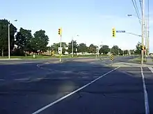 Rexdale Boulevard is a short, but major east–west but mostly diagonal roadway in Rexdale, a neighbourhood in Toronto, and begins as a spur road off Islington Avenue just north of the 401. This spur originally began in the former village of Weston as a road northwest to what would later become Brampton, Ontario. The current road passes through a mostly light industrial stretch of north Etobicoke. West of Highway 427, Rexdale Boulevard becomes Derry Road and enters the city of Mississauga. Derry Road is also signed as Peel Regional Road 5, an east–west route that travels the entire length of the city of Mississauga and Peel Region. Derry Road is the northern boundary of Toronto Pearson International Airport. The intersection of Derry Road and Airport Road was once the site of Malton, itself a part of Mississauga. West of the intersection with Mavis Road, the road makes a large arc around the former village of Meadowvale. The bypassed stretch was renamed Old Derry Road and can also be seen in a small stretch of Syntex Crescent. Derry Road is named for the "lost village" of Derry West, which was located around the Hurontario Street and Derry Road intersection.[2] Derry West was named after Derry in Northern Ireland and home of many settlers in the area.