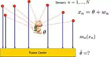 Let denote the position of interest. A set of sensors acquire measurements contaminated by an additive noise owing some known or unknown probability density function (PDF). The sensors transmit measurements to a central processor. The th sensor encodes by a function . The application processing the data applies a pre-defined estimation rule . The set of message functions and the fusion rule are designed to minimize estimation error. For example: minimizing the mean squared error (MSE), .