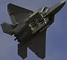 The F-22 has three internal weapons bays: a large main bay on the bottom of the fuselage, and two smaller bays on the sides of the fuselage, aft of the engine intakes.[125] The main bay is split along the centerline and can accommodate six LAU-142/A launchers for beyond-visual-range missiles and each side bay has an LAU-141/A launcher for short-range missiles.[126] Four of the launchers in the main bay can be replaced with two bomb racks that can each carry one 1,000 lb (450 kg) or four 250 lb (110 kg) bombs.[95] Carrying armaments internally maintains the aircraft's stealth and minimizes additional drag. Missile launches require the bay doors to be open for less than a second, during which pneumatic or hydraulic arms push missiles clear of the aircraft; this is to reduce vulnerability to detection and to deploy missiles during high speed flight.[127]