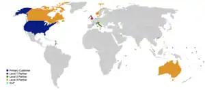 The United States is the primary customer and financial backer, with planned procurement of 1,763 F-35As for the USAF, 353 F-35Bs and 67 F-35Cs for the USMC, and 273 F-35Cs for the USN.[12] Additionally, the United Kingdom, Italy, the Netherlands, Canada, Turkey, Australia, Norway, and Denmark have agreed to contribute US$4.375 billion towards development costs, with the United Kingdom contributing about 10% of the planned development costs as the sole Tier 1 partner.[68] The initial plan was that the U.S. and eight major partner nations would acquire over 3,100 F-35s through 2035.[69] The three tiers of international participation generally reflect financial stake in the program, the amount of technology transfer and subcontracts open for bid by national companies, and the order in which countries can obtain production aircraft.[70] Alongside program partner countries, Israel and Singapore have joined as Security Cooperative Participants (SCP).[71][72][73] Sales to SCP and non-partner nations, including Belgium, Japan, and South Korea, are made through the Pentagon's Foreign Military Sales program.[74][7] Turkey was removed from the F-35 program in July 2019 over security concerns.[75][76][N 9]