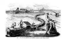 Work started on a 3 ft 8 1⁄2 in (1,130 mm) narrow gauge line from Euston to Holborn in September 1863.[8] The tubes were constructed by the Staveley Coal and Iron Company.[9] The first 'trains' ran on 10 October 1865 after a demonstration in which the chairman, Richard Temple-Grenville, 3rd Duke of Buckingham and Chandos, travelled from Holborn to Euston in one of the capsules.[10][11]