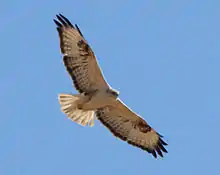 In flight, the long-legged buzzards appears as a mid-sized rather broad-bodied raptor. Possessing an almost eagle-like silhouette, it tends to appear with a protruding head with a somewhat heavy bill, long broad wings with fairly straight edges and only slightly tapering hands with rounded five-fingered end. It is relatively long-tailed with the tail having a fairly rounded shape. Juveniles tend to be slimmer looking with narrower wings and more S-shaped trailing edges as well as a somewhat longer tail. Long-legged buzzards tend to fly with comparatively slow, deep beats and to have a relatively slow flight. The species glides with their arms raised and hands more level, wings noticeably kinked at carpals and soars in wide circles with the wings in shallow dihedral. The upward bent tips can enhance their eagle-like appearance. Long-legged buzzards often hover frequently and for extended periods.[3][6] In the flight, the whitish based orangey tail often looks all white at a distance and to stand out in its paleness against the dark rear body and the rear wings. The primary coverts and many greater coverts are blackish in adult long-legged buzzards with the greater coverts pale tipped. Adults are dark grey on the flight feathers with blackish bars radiating outwards on wingtips and on the trailing edges. The underwing coverts are usually lightly streaked with rufous in pale adults, while intermediate adult has a stranger contrast from pale head and breast to darker, browner upperbody and wing coverts, breast and wing linings. The flying rufous adult tends to look more uniform above with colours varying from ochre to tawny to darker rufous brown and to possess richer coloured darker parts, with the tail very variable in rufous morph.[3][7] Dark adult in flight may appear with or without a pale nape patch. Dark morph long-legged buzzards above evidence pale bases to primaries, some less dark individuals showing slight contrast of brown-tinged wigng coverts against blacker carpal areas with grayish cast to secondaries but tail more obviously pale and greyer and variable. Below dark morph adult striking contrasting from dark body and underwing coverts against pale flight feathers.[3] Juvenile long-legged buzzards are evidently more streaky in pale, intermediate and rufous morphs with differing wing shape. Juveniles of the 3 morphs have comparatively uniform secondaries above with a paler based hand, the inner four primaries being thinly barred, the whitish tail becoming greyer brown and appear indistinctly barred distally. The trailing wing edges are more diffuse, greyer and narrower than on adults with a dark line often evidence along greater coverts. Dark morph juveniles in flight even more uniform above without darker trailing edges above and below greyish secondaries are much duskier-looking with broader but diffuse barring and often markedly wide trailing edges, this increasing the contrast against the dark tipped whitish hand.[3][6][7]