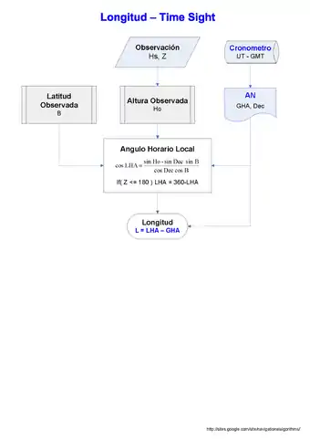 Time sight is a general method for determining longitude by celestial observations using a chronometer; these observations are reduced by solving the navigational triangle for meridian angle and require known values for altitude, latitude, and declination; the meridian angle is converted to local hour angle and compared with Greenwich hour angle.