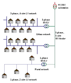 Distribution transformers or secondary transformers, placed along feeders, convert the voltage from the medium to a low voltage level, suitable for direct consumption by end customers (mains voltage).[3] Typically, a rural primary feeder supplies up to 50 distribution transformers, spread over a wide region,[4] but the figure significantly varies depending on configuration. They are sited on pole tops, cellars or designated small plots.[2] From these transformers, low-voltage or secondary network branches off to the customer connections at customer premises, equipped with electricity meters.[3]
