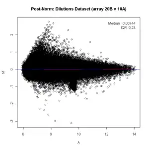 An MA plot is an application of a Bland–Altman plot for visual representation of genomic data. The plot visualizes the differences between measurements taken in two samples, by transforming the data onto M (log ratio) and A (mean average) scales, then plotting these values. Though originally applied in the context of two channel DNA microarray gene expression data, MA plots are also used to visualise high-throughput sequencing analysis.[1][2]