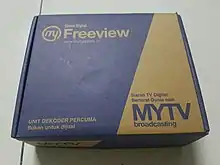MYTV Broadcasting or MYTV is a Malaysian television broadcasting company providing free digital terrestrial television (DTT) in the country, considered a first of its kind in the country.[1] It is owned by Altel Holdings/Altel Communications. [2] The DTT service is officially branded as myFreeview since August 2015, though the legal name of the company remained unchanged [3] A billion MYR deal have been signed with Telekom Malaysia to distribute the services.[4] The set top box has been available for sale as of February 2017, after long delays of building infrastructure and other issues.[5][6][7][8]