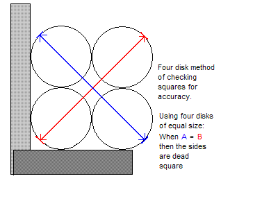 Machinist squares can have a linear error of no greater than 0.0002 in/in.[1] Squares must be occasionally checked for accuracy. The four disk method is one way to verify overall squareness. However, it cannot detect bent blades.