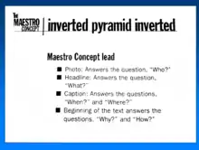 The Maestro concept is a time-management technique for story planning and newsroom organization through team collaboration to shape stories early before they are written. The central concept is trying to anticipate readers’ questions about news stories (“think like a reader”) and then answering those questions as quickly as possible through visual aspects with high-visibility points such as photos, headlines, captions and information graphics. It is a management technique to encourage collaboration across news departments and ensure that quality work in a story package comes not from the traditional method of an assembly line, but from teamwork and good time-management from all players working on the story.