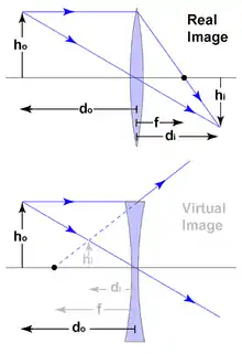 The image recorded by a photographic film or image sensor is always a real image and is usually inverted. When measuring the height of an inverted image using the cartesian sign convention (where the x-axis is the optical axis) the value for hi will be negative, and as a result M will also be negative. However, the traditional sign convention used in photography is "real is positive, virtual is negative".[1] Therefore, in photography: Object height and distance are always real and positive. When the focal length is positive the image's height, distance and magnification are real and positive. Only if the focal length is negative, the image's height, distance and magnification are virtual and negative. Therefore, the photographic magnification formulae are traditionally presented as