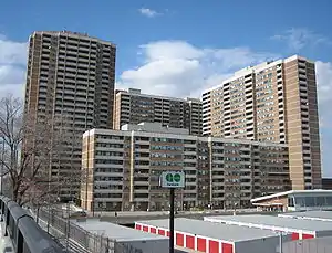 CMHC sold its share of the building in 1998, and it is now a fully private enterprise. Since 1998, there has been significant investment in improvements to the existing buildings. These improvements have occurred in stages and have included updates to the building facades, lobbies, halls and infrastructure (boilers, windows, elevators and roofs); improvements to the centre court and garage (reconstruction of the eastern section of the garage, repainting and additional landscaping). By the latter part of the 2000s, there was revitalization of the shops and services along Danforth Avenue, and conversion of vacant office and locker space into units providing better supervision of the open space around the building.[1] The revitalization of the complex is in step with the gentrification and building boom that was happening in the 2000s, but was subsequently dampened by the influx of gangs and prostitution in late 2007 on Danforth just to the east.