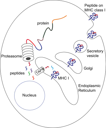 - In MHC class I, any nucleated cell normally presents cytosolic peptides, mostly self peptides derived from protein turnover and defective ribosomal products. During viral infection, intracellular microorganism infection, or cancerous transformation, such proteins degraded in the proteosome are as well loaded onto MHC class I molecules and displayed on the cell surface. T lymphocytes can detect a peptide displayed at 0.1%-1% of the MHC molecules.