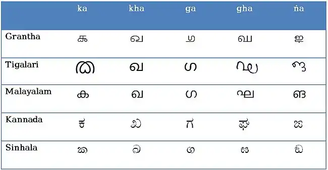 Malayalam and Tigalari are sister scripts are descended from Grantha alphabet. Both share similar glyphic and orthographic characteristics.