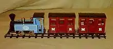 This is the 'classic' Mamod model and has been in production with minor updates and modifications for nearly 50 years. It is a model of a typical traction engine with a full-length canopy. The engine itself is an oscillating-cylinder unit, the same as the SR1/a which is based on the old MM2 unit. The boiler is longer than that on the SR1 although it is the same volume internally. The front part is an empty void into which, in the earlier versions, the exhaust steam was fed through the choke (it controlled the exiting steam not the inlet steam). The TE1a differs from the TE1 in having a reversing lever to control the speed and direction of the model (initially used on the MEC1 of 1965 and subsequently applied to the TE in 1967), whereas the TE1 was uni-directional only with an exhaust 'choke' to control the speed. The TE1 was claimed to cover a third of a mile in ten minutes on a single filling.[5] Power is delivered to the back axle by means of a drive band running from a small pulley on the flywheel to the rim of one of the back wheels. This can be removed to allow the engine to run stationary or to drive a lineshaft and tools. The front axle of the model is mounted on a central pivot with a simple copper stub spring, which provides a crude form of suspension. It is also steerable, by means of a shaft running from the axle up inside the chimney (later models post 67). Early models did not use the later control rod for steering but used a rod mounted directly into a hole in the early model square axle box. Both designs could be screwed down to lock the wheels in a fixed position. A control rod, with a wooden handle on top, can be attached to the top of this shaft to allow the operator to steer the model as it moves. The TE1/A has a green boiler (this green has varied over the years from apple green to a dark brunswick green, similar to GWR locomotives), red spoked wheels and flywheel, a white/cream coloured canopy and a black firebox/smokebox/chimney. It is also available in a distinctive alternative paint scheme, with a polished brass boiler and maroon wheels. Other limited edition models have been produced in the last decade using blue or black paintwork, as well of variations of the colours mentioned already.