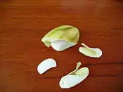 Fat is extracted from dried mango kernels by hydraulic pressure,[2] or by solvent extraction.[3] In solvent extraction, hexane, a liquid hydrocarbon, is used as the extraction medium. The collected mango stones are washed with well-water soon after collection. After washing, the seeds are sun dried to reduce the moisture content to 12-15%. The dried seed stone is roasted in a drum roaster and the hull is removed mechanically, or manually by beating with wooden clubs. The separated kernels are crushed into small pieces in a hammer mill. The mango kernel pieces are conveyed to a pellet making machine and pellets are formed. The pellets are cooled to room temperature in a cooler and are conveyed to the solvent extraction plant. Some processors produce flakes by crushing the seeds in a flaking roller mill.[4]