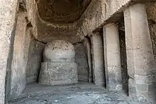 Near the south-east end of the hill is the second group, consisting of an unfinished Chaitya-cave and a number of ruined cells and viharas (19.1858°N 73.8843°E). This Chaitya-cave is somewhat on the plan of the Bedsa one, that is, it has two octagonal columns in front, supporting the entablature above the great window. These columns are of the style occurring at the Ganesa Lena, with water-pot bases and capitals; but otherwise this cave is quite unfinished: the aisles have not been commenced; the capital of the dagoba is roughly blocked out, and portions of a square mass of rock from which to hew out the dome of it; but a great fault in the rock at the back of the cave seems to have stopped further operations.[3]