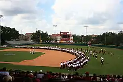 "Skull Session" - The Chiefs perform together at a pregame "Skull Session" before each home football game in Tallahassee. When Manley Whitcomb came to Florida State University from Ohio State University he brought several traditions with him, one of those being the "Skull Session." The idea is that the Chiefs get the music into their skulls before the game and can focus more on the marching and visual performance during the game. Originally, Skull Session was held in Opperman Music Hall but has since become a public performance. Now, performing on Mike Martin Field at Dick Howser Stadium (located next to Doak Campbell Stadium), the Chiefs perform section cheers and then go on to give the audience a sneak preview of the day's halftime show selections. Most section cheers tend to be either well-known pop songs, opportunities to poke fun at school opponents/other sections or inside jokes. All cheers are arranged by students who are current/alumni Chiefs.[41]