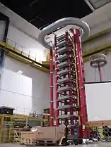 A Marx generator is an electrical circuit first described by Erwin Otto Marx in 1924.[1] Its purpose is to generate a high-voltage pulse from a low-voltage DC supply. Marx generators are used in high-energy physics experiments, as well as to simulate the effects of lightning on power-line gear and aviation equipment. A bank of 36 Marx generators is used by Sandia National Laboratories to generate X-rays in their Z Machine.