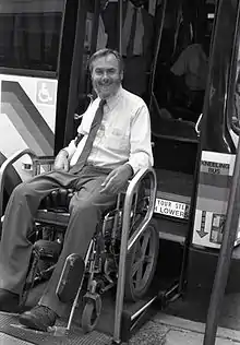 Starkloff was passionate about disability rights and was one of the leaders of the "independent living movement," a grassroots movement meant to inspire young people with disabilities to take control of their own care.[4] The Max Starkloff Lifetime Achievement Award from the National Council on Independent Living was named after him. In 1970, while living in a nursing home, Starkloff founded Paraquad. The goal of the company was to help people with disabilities live independently. One year later, in 1971, he began the St. Louis chapter of the National Paraplegia Foundation. He continued to fight for disability rights and was able to convince St. Louis officials to install curb cuts on the sidewalks of the city. He would often say: "I'm not 'confined' to a wheelchair. I'm confined to what society tells me I'm confined to."[3] In 1983, he co-founded the American National Council on Independent Living (NCIL) with Marca Bristo and Charlie Carr.[5] He fought for the passage of the Americans with Disabilities Act, which passed in 1990. Starkloff sought to make the world more accessible for the disabled; in addition to the city sidewalks, he was also involved in making the St. Louis Zoo create accessible facilities.[3] In 2003, he and his wife Colleen began the Starkloff Disability Institute in downtown St. Louis, which sought to work with employers in hiring disabled people. He won a President's Distinguished Service Award in 1991, and was awarded a star on the St. Louis Walk of Fame.[6]