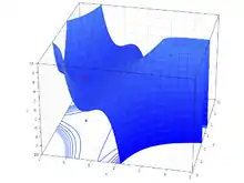 For functions of more than one variable, similar conditions apply. For example, in the (enlargeable) figure on the right, the necessary conditions for a local maximum are similar to those of a function with only one variable. The first partial derivatives as to z (the variable to be maximized) are zero at the maximum (the glowing dot on top in the figure). The second partial derivatives are negative. These are only necessary, not sufficient, conditions for a local maximum, because of the possibility of a saddle point. For use of these conditions to solve for a maximum, the function z must also be differentiable throughout. The second partial derivative test can help classify the point as a relative maximum or relative minimum. In contrast, there are substantial differences between functions of one variable and functions of more than one variable in the identification of global extrema. For example, if a bounded differentiable function f defined on a closed interval in the real line has a single critical point, which is a local minimum, then it is also a global minimum (use the intermediate value theorem and Rolle's theorem to prove this by reductio ad absurdum). In two and more dimensions, this argument fails. This is illustrated by the function