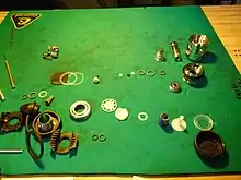 The mechanism of diving regulators is the arrangement of components and function of gas pressure regulators used in the systems which supply breathing gases for underwater diving. Both free-flow and demand regulators use mechanical feedback of the downstream pressure to control the opening of a valve which controls gas flow from the upstream, high-pressure side, to the downstream, low-pressure side of each stage.[1] Flow capacity must be sufficient to allow the downstream pressure to be maintained at maximum demand, and sensitivity must be appropriate to deliver maximum required flow rate with a small variation in downstream pressure, and for a large variation in supply pressure, without instability of flow. Open circuit scuba regulators must also deliver against a variable ambient pressure. They must be robust and reliable, as they are life-support equipment which must function in the relatively hostile seawater environment, and the human interface must be comfortable over periods of several hours.