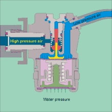 The piston in the first stage is rigid and acts directly on the seat of the valve. The pressure in the intermediate pressure chamber drops when the diver inhales from the demand valve, this causes the piston to lift off the stationary valve seat as the piston slides into the intermediate pressure chamber. The now open valve permits high pressure gas to flow into the low pressure chamber until the pressure in the chamber has risen enough to push the piston back into its original position against the seat and thus close the valve.[1]:9–13