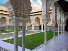 The term meshwar is later used to refer to reception areas or council chambers in the palaces of the region during the 13th-14th centuries and later. A meshwar was part of the citadel of al-Mansourah built by the Marinids in the 14th century just outside Tlemcen, Algeria, for example.[11] Before this, also in Tlemcen, the Zayyanids created a royal citadel known as the Qal'at al-Mashwar ("Citadel of the Mechouar"), located on an earlier Almohad fortress, which acted as the royal residence and center of power in the city in many periods.[2]:223 A meshwar section (now known as the Mexuar in Spanish) was also part of the Nasrid Palaces in the Alhambra of Granada, Spain. It was composed of a main external entrance gate followed by two consecutive courtyards leading to a council chamber at its eastern end, all of which was separate from the emir's palaces (the Comares Palace the Court of the Lions) further east. A number of other chambers were arranged around the courtyards, with the first courtyard likely being used by the secretaries and officials of the state administration, including the chancery or diwan, while the second courtyard was used by the emir for official audiences. The first courtyard even had its own mosque.[2]:269–272