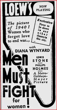Men Must Fight is a 1933 American pre-Code drama film starring Diana Wynyard, Lewis Stone and Phillips Holmes.[2] It is based on the 1932 Broadway play of the same name by Reginald Lawrence and S. K. Lauren.[3] When her lover is killed in World War I, a woman raises their son as a pacifist. However, when a second world war looms "between the United States and a country referred to as the Eurasian States in 1940", that belief is put to the test.[3][4]