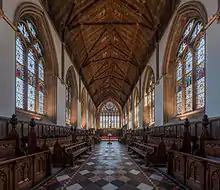A new choral foundation was established in 2007, providing for a choir of sixteen undergraduate and graduate choral scholars singing from October 2008. The choir was formerly directed by Peter Phillips, director of the Tallis Scholars, and is now directed by Benjamin Nicholas, a former director of music at Tewkesbury Abbey.[20] In 2013, the installation of a new organ, designed and built by Dobson Pipe Organ Builders, was completed.[21] The chapel is famous for its splendid, ethereal acoustics.