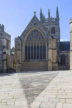 By the late 1280s the old church of St John the Baptist had fallen into "a ruinous condition",[17] and the college accounts show that work on a new church began in about 1290. The present choir, with its enormous east window, was complete by 1294. The window is an important example (because it is so well dated) of how the strict geometrical conventions of the Early English Period of architecture were beginning to be relaxed at the end of the 13th century.[18] The south transept was built in the 14th century, the north transept in the early years of the 15th. The great tower was complete by 1450. The chapel replaced the parish church of St. John and continued to serve as the parish church as well as the chapel until 1891. It is for this reason that it is generally referred to as Merton Church in older documents, and that there is a north door into the street as well as doors into the college. This dual role also probably explains the enormous scale of the chapel, which in its original design was to have a nave and two aisles extending to the west.[19]