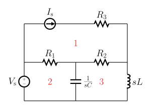 If a voltage source is present within the mesh loop, the voltage at the source is either added or subtracted depending on if it is a voltage drop or a voltage rise in the direction of the mesh current. For a current source that is not contained between two meshes (for example, the current source in essential mesh 1 in the circuit above), the mesh current will take the positive or negative value of the current source depending on if the mesh current is in the same or opposite direction of the current source.[3] The following is the same circuit from above with the equations needed to solve for all the currents in the circuit.