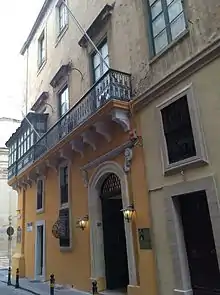 The Messina Palace is located on a street corner of Strada San Cristoforo with Republic Street. Historically Strada San Cristoforo was named Strada della Fontana in referenced to a spring in the area that served the population with drinking water.[1] During the French occupation the street was known as Rue des Droits de l'Homme . The building is built from grey stone but the lower part of the building is painted yellow. The balustrades of the balcony, supported by white brackets are painted black as are the bars to the windows. The door is green and is surrounded by a white frame. The courtyard to the building is arched. The main hall is elegant, with a grand staircase and marble furnishings. The Messina family coat of arms can still be seen inlaid into the marble in the Palace's main hall whose ceiling is surrounded by colorful frescoes.[1] The Messina Palace has its own private chapel with a marble altar.[1] The chapel has a very high ceiling but is narrow in width. Tall glass doors access it, the walls are painted white and the floor is chequered with yellow and white tiles. A traditional Maltese spiral staircase leads up to the roof. A bar and coffee shop is located on the ground floor.