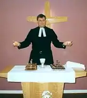 Methodism was endowed by the Wesley brothers with worship characterised by a twofold practice: the ritual liturgy of the Anglican Book of Common Prayer on the one hand and the simple Protestant preaching service on the other.[97] Listening to the reading of Scripture and a sermon based upon the biblical text is virtually always included in Methodist worship. The Methodist Church follows the Revised Common Lectionary, in common with other major denominations in Britain.[98] Similar to most historic Christian churches, the Methodist Church has official liturgies for services such as Holy Communion (the Lord's Supper), baptism, ordination and marriage. These and other patterns of worship are contained in the Methodist Worship Book, the most recent Methodist service book.[99] It states in its preface that worship is "a gracious encounter between God and the Church. God speaks to us, especially through scripture read and proclaimed and through symbols and sacraments. We respond chiefly through hymns and prayers and acts of dedication."[100] Methodism has generally allowed for freedom in how the liturgy is celebrated—the Worship Book serves as a guideline, but ministers, preachers and other worship leaders are not obligated to use it.[note 3]