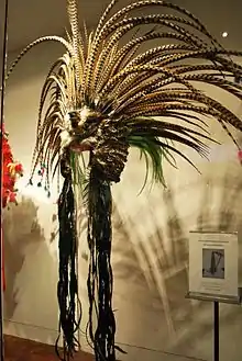 Feathers were valued similarly to jade and turquoise in Mesoamerica. They were considered to have magical properties as symbols of fertility, abundance, riches and power and those who used them were associated with divine powers.[7] Evidence of use goes back at least as far as the Mayas, with depictions of them on the murals at Bonampak. The Mayans also raised birds in part for feathers.[8][9] Toltec groups were making feathered items from black and white feathers of local origin.[5] The most developed use of feathers in Mesoamerica was among the Aztecs, Tlaxcaltecs and Purepecha.[1] Feathers were used to make many types of objects from arrows, fly whisks, fans, complicated headdresses and fine clothing.[10] By the reign of the Aztec ruler Ahuizotl, richer feathers from tropical areas came to the Aztec Empire with quetzal and the finest feathers used by Moctezuma's reign.[5] Feathers were used for ceremonial shields, and the garments of Aztec eagle warriors were completely covered in feathers. Feather work dressed idols and priests as well.[11] Moctezuma asked the Purépecha for help against the Spanish by sending gifts that included quetzal feathers. Among the Purépecha, feathers were used similarly, for ceremonial shields, bucklers, doublets for the cazonci or ruler and feather ceremonial garments for priests, warriors and generals. To declare war, the Purépecha showed enemies wood covered in feathers and send highly prized green feathers to allies and potential allies. Soldiers who died in war were buried with feathers.[12][13]