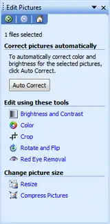 Basic image editing features include color correct, crop, flip, resize, and rotate. Advanced features include brightness, contrast, hue, and saturation adjustment; batch processing; compression; and red-eye removal.[15] An AutoCorrect command can automatically adjust brightness, contrast, and color. All editing capabilities are listed on an Edit Pictures task pane.[12] Images can be compressed with options for insertion into documents, email, or web pages.[16] After editing, users can view or discard unsaved changes, overwrite the original image, rename and save the new image, or export it to another location. Users can also share images in email, to an intranet location, or to a SharePoint library.[7] Picture Manager users running Windows 2000 cannot print images from the application, as this feature requires a wizard distributed with Windows XP.[17]