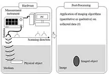 To increase the cross-range resolution of the imaging system, several antennas should be distributed over an area (which is called the sampling area) with a spacing less than the operating wavelength. However, the mutual coupling between the antennas, which are placed close to each other, may degrade the accuracy of the collected signals. Moreover, the transmitter and receiver system will become very complex. To address these problems, one single scanning antenna is used instead of several antennas. In this configuration, the antenna scans over the entire sampling area, and the collected data is mapped together with their antenna position coordinates. In fact, a synthetic (virtual) aperture is produced by moving the antenna (similar to the synthetic aperture radar principle[2]). Later, the collected data, which is sometimes referred to as raw data, is fed into the software for processing. Depending on the applied processing algorithm, microwave imaging techniques can be categorized as quantitative and qualitative.