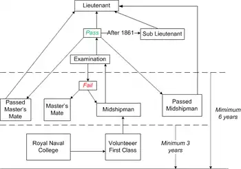Failure usually meant six more months of sea service before the examination could again be attempted. Some men never passed it. Successful completion made the midshipman a 'passed midshipman'.[25] From the 18th century until the second half of the 19th century, a midshipman in the Royal Navy who passed the lieutenant's examination did not automatically receive a commission. Midshipmen with political connections were promoted first, while others would wait their turn on a roster. During wartime, when large numbers of ships and men might be lost in battle, most passed midshipman would be promoted in a year or two, but during peacetime the wait might be so long that the midshipman would eventually be considered too old and lose his chance for a commission.[26]