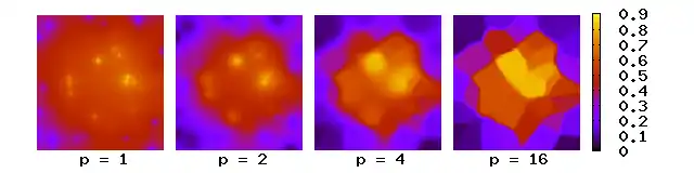 The simplest weighting function in common usage is based upon the inverse of the distance of the sample from the point to be estimated, usually raised to the second power, although higher or lower powers may be useful.[1]