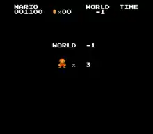 The Minus World is a glitched level found in the 1985 Nintendo Entertainment System video game Super Mario Bros., which is found after World 1-2. In order to encounter it, players must maneuver Mario through the bricks separating the normal exit from the Warp Zone area. So long as players do not lock the screen in position, players can make Mario enter the first Warp Pipe before the "Welcome to Warp Zone!" text is revealed. The console did not have a method to check for collisions between tiles, and the task of checking all points around a tile for possible collision points was too difficult for the game's MOS Technology 6502. To compensate for this, the designers put boundary boxes around objects and compare a limited number of collision boundaries. Mario's sprite has two points, one on each foot, each detecting his collision with the floor. The game would normally eject Mario in the opposite direction he is going if he is considered inside a block, which can be averted by crouching while jumping into it and, at the exact right moment, pushing left, causing him to be ejected on the other side of the wall. The game then erroneously sets the far-left Warp Pipe to send him to World -1.[1] When players successfully pull this off, they are presented with a screen reading World -1, and then Mario is put in a water level that loops the end with the beginning, and as a result, cannot be beaten. It is a copy of the stage, World 7-2, aside from the looping.[2] The level is identified in the internal memory as "World 36-1," but when it tries to display this, 36 is replaced with a blank space.[3] The reason the glitch occurs is because of a misread byte.[4]