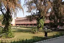 Miranda House was founded in 1948 by the university vice-chancellor, Sir Maurice Gwyer.[5] In a magazine published by him in 1952, he wrote three reasons as to why the college was called Miranda. His favorite actress was Carmen Miranda, his daughter's name was Miranda, and a character named Miranda in William Shakespeare’s play The Tempest was, according to him, a perfect example of what a lady should be. Its foundation stone was laid by Lady Edwina Mountbatten on 7 March in the same year. Miranda House is built of red bricks on the university campus. Its original design was planned by the architect Walter Sykes George and is architecturally similar to other educational institutions in India founded in the colonial era. As the college grew, several buildings were added.