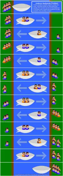 The missionaries and cannibals problem, and the closely related jealous husbands problem, are classic river-crossing logic puzzles.[1] The missionaries and cannibals problem is a well-known toy problem in artificial intelligence, where it was used by Saul Amarel as an example of problem representation.[2][3]