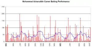 He was known for his wristy strokeplay, much like Indian cricketer Vishwanath and Pakistani cricketer Zaheer Abbas. Azharuddin made his debut for the Indian cricket team in Test cricket in 1984 against England at Eden Gardens in Kolkata on 31 December 1984, where he scored 110 in his first innings from 322 deliveries, alongside Ravi Shastri who scored 111, in what was ultimately a drawn match. He subsequently scored two more centuries in his next two Test matches. He scored an aggressive 121 against England at Lord's in 1990. India was faced with the prospect of a follow-on when Azharuddin came in to bat at number five and scored his hundred off 88 balls in a losing cause. Former England cricketer Vic Marks called it "the most dazzling Test century" he had ever witnessed, in his column for the Observer.[7] In the Second Test in Manchester, Azharuddin made 179 in reply to England's first innings total of 519. Playing attacking cricket, he made 103 runs off 107 balls between lunch and tea on day three, while putting on a 112-run stand with Sachin Tendulkar. Playing his 39th Test, he reached his 10th Test century off 155 balls.[8] The match ended in a draw.[9] Azharuddin ended the series with 426 runs at 85.20.[10] This tally was the highest by an Asian captain in a Test series in England until 2018 when it was broken by Virat Kohli.[11]