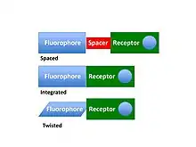 A large number of examples of chemosensors have been developed by scientists in physical, life and environmental sciences. The advantages of fluorescence emission being 'switched on' from 'off' upon the recognition event enabling the chemosensors to be compared to 'beacons in the night'. As the process is reversible, the emission enhancement is concentration dependent, only becoming 'saturated' at high concentrations (fully bound receptor). Hence, a correlation can be made between luminescence (intensity, quantum yield and in some cases lifetime) and the analyte concentration. Through careful design, and evaluation of the nature of the communication pathway, similar sensors based on the use of 'on-off' switching, or 'on-off-on,' or 'off-on-off' switching have been designed. The incorporation of chemosensors onto surfaces, such as quantum dots, nanoparticles, or into polymers is also a fast-growing area of research.[44][45][46] Other examples of chemosensors that work on the principle of switching fluorescent emission either on or off include, Förster resonance energy transfer (FRET), internal charge transfer (ICT), twisted internal charge transfer (TICT), metal-based emission (such as in lanthanide luminescence),[47][48] and excimer and exciplex emission and aggregation-induced emission (AIE).[49][50] Chemosensors were one of the first examples of molecules that could result in switching between 'on' or 'off' states through the use of external stimuli and as such can be classed as synthetic molecular machine, to which the Nobel Prize in Chemistry was awarded to in 2016 to Jean-Pierre Sauvage, Fraser Stoddart and Bernard L. Feringa.