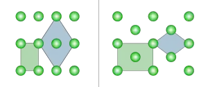 In the monoclinic system there is a rarely used second choice of crystal axes that results in a unit cell with the shape of an oblique rhombic prism;[1] it can be constructed because the rectangular two-dimensional base layer can also be described with rhombic axes. In this axis setting, the primitive and base-centered lattices swap in centering type.