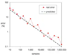 In principle, Monte Carlo methods can be used to solve any problem having a probabilistic interpretation. By the law of large numbers, integrals described by the expected value of some random variable can be approximated by taking the empirical mean (a.k.a. the sample mean) of independent samples of the variable. When the probability distribution of the variable is parametrized, mathematicians often use a Markov chain Monte Carlo (MCMC) sampler.[3][4][5] The central idea is to design a judicious Markov chain model with a prescribed stationary probability distribution. That is, in the limit, the samples being generated by the MCMC method will be samples from the desired (target) distribution.[6][7] By the ergodic theorem, the stationary distribution is approximated by the empirical measures of the random states of the MCMC sampler.