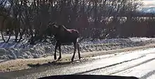 Moose avoid areas with little or no snow as this increases the risk of predation by wolves and avoid areas with deep snow, as this impairs mobility. Thus, moose select habitat on the basis of trade-offs between risk of predation, food availability, and snow depth.[17] With reintroduction of bison into boreal forest, there was some concern that bison would compete with moose for winter habitat, and thereby worsen the population decline of moose. However, this does not appear to be a problem. Moose prefer sub-alpine shrublands in early winter, while bison prefer wet sedge valley meadowlands in early-winter. In late-winter, moose prefer river valleys with deciduous forest cover or alpine terrain above the tree line, while bison preferred wet sedge meadowlands or sunny southern grassy slopes.[18]