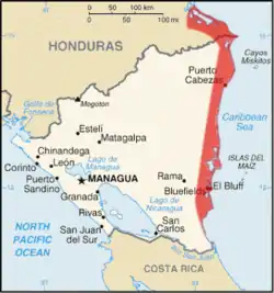 The Mosquito Coast, also known as the Miskito Coast and the Miskito Kingdom, historically included the kingdom's fluctuating area along the eastern coast of present-day Nicaragua and Honduras. It formed part of the Western Caribbean Zone. It was named after the local Miskito Amerindians and was long dominated by British interests. The Mosquito Coast was incorporated into Nicaragua in November 1894; however, in 1960, the northern part was granted to Honduras by the International Court of Justice.[1]