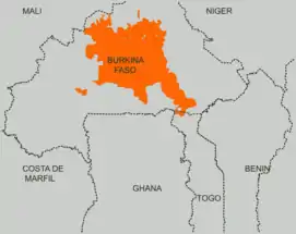 ![]() Majority areas of Mossi speakers, in pink, on a map of Burkina Faso | |