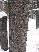 A lodgepole pine tree infested by the mountain pine beetle, with visible pitch tubes