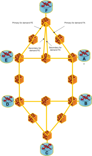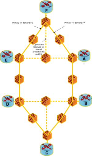 Shared backup path protection (SBPP) for multicast connections: The SBPP technique can be used for multicast connections at the optical layer because of its resource efficiency, due to the fact that the backup paths can share wavelength channels on links while their corresponding primary paths are link disjoint. Paths can share links with working paths and protection paths of other leaves. In Fig 4 FE and FA are primary paths. The optical line is reserved for shared protection of both FE and FA.